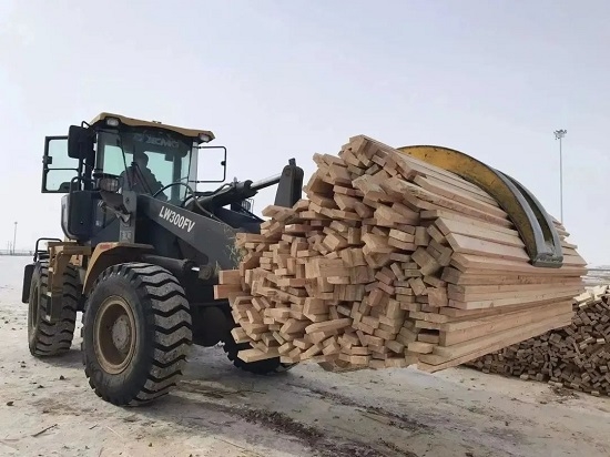 现场部交付车司机王日辉按作业顺序正在等待装载板材,装车后交付市内木材加工厂。